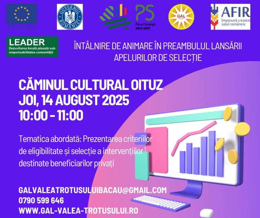 Asociația GAL Valea Trotușului Bacău vă invită joi, 14 august 2025, ora 10:00, la Căminul Cultural Oituz, la o întâlnire de animare organizată în preambulul lansării apelului de selecție destinat beneficiarilor privați.