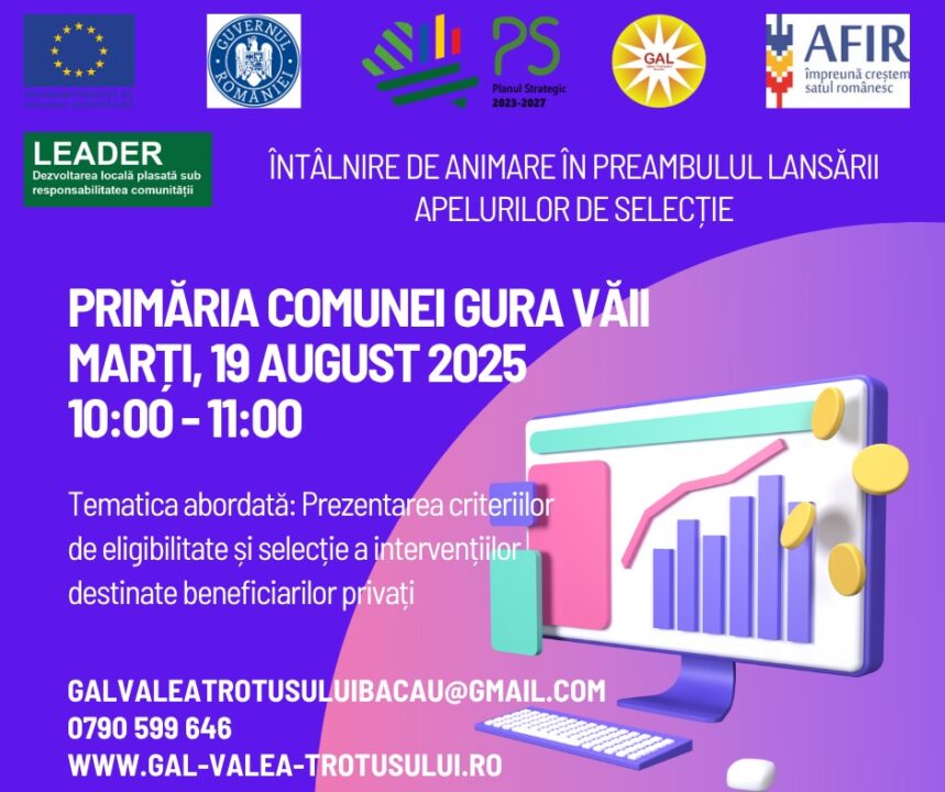 Asociația GAL Valea Trotușului Bacău vă invită marți, 19 august 2025, ora 10:00, la sediul Primăriei Comunei Gura Văii, la o întâlnire de animare organizată în preambulul lansării apelului de selecție destinat beneficiarilor privați.